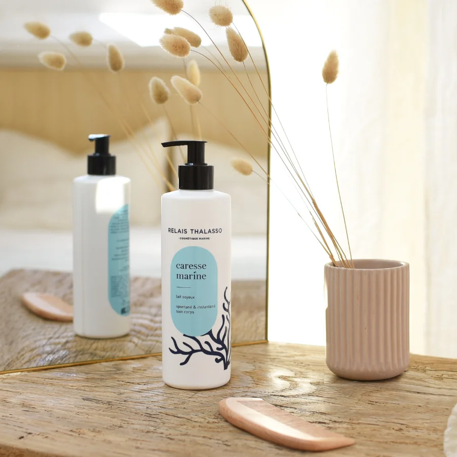 Je suis la Caresse Marine, votre lait hydratent pour le corps soyeux qui vous enveloppe d’une vague de douceur dès la première application. Tel un souffle d’océan sur votre peau, ma texture légère pénètre instantanément pour laisser place à une sensation de bien-être immédiat.