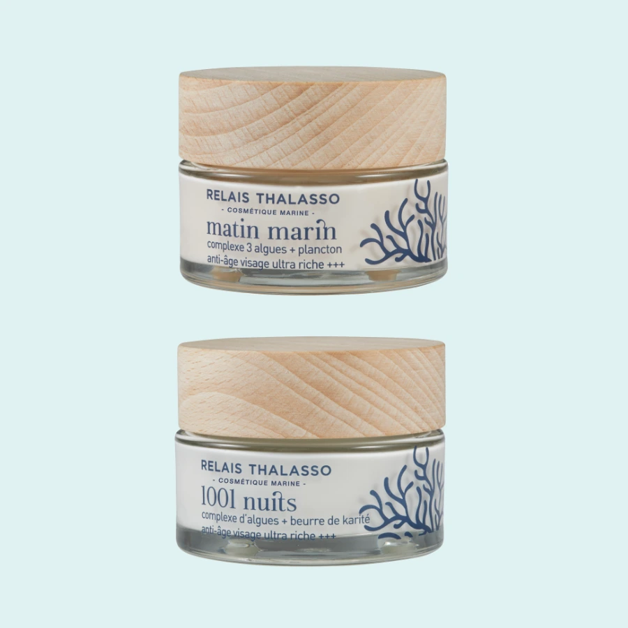 Je suis le Duo Jeunesse, votre rituel anti-âge marin pour une peau visiblement plus ferme, éclatante et repulpée, du réveil jusqu’au coucher.
