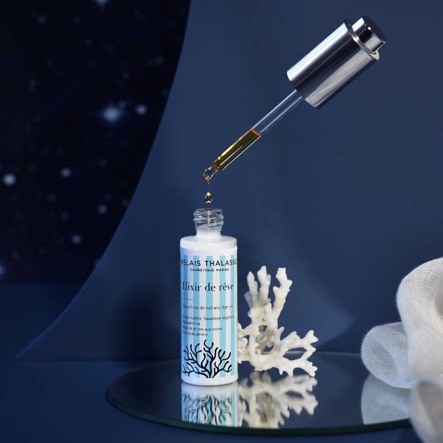 Je suis Élixir de Rêve, le soin de nuit à la texture huileuse et soyeuse, sans effet collant, qui enveloppe la peau de douceur avant le sommeil.