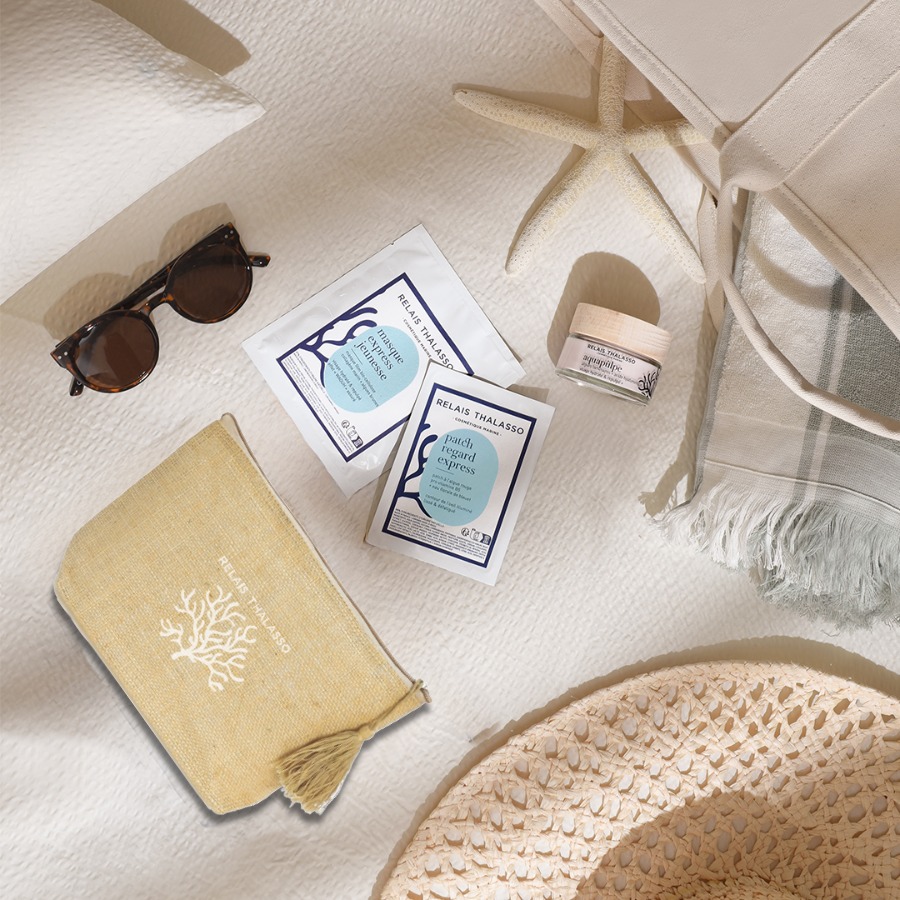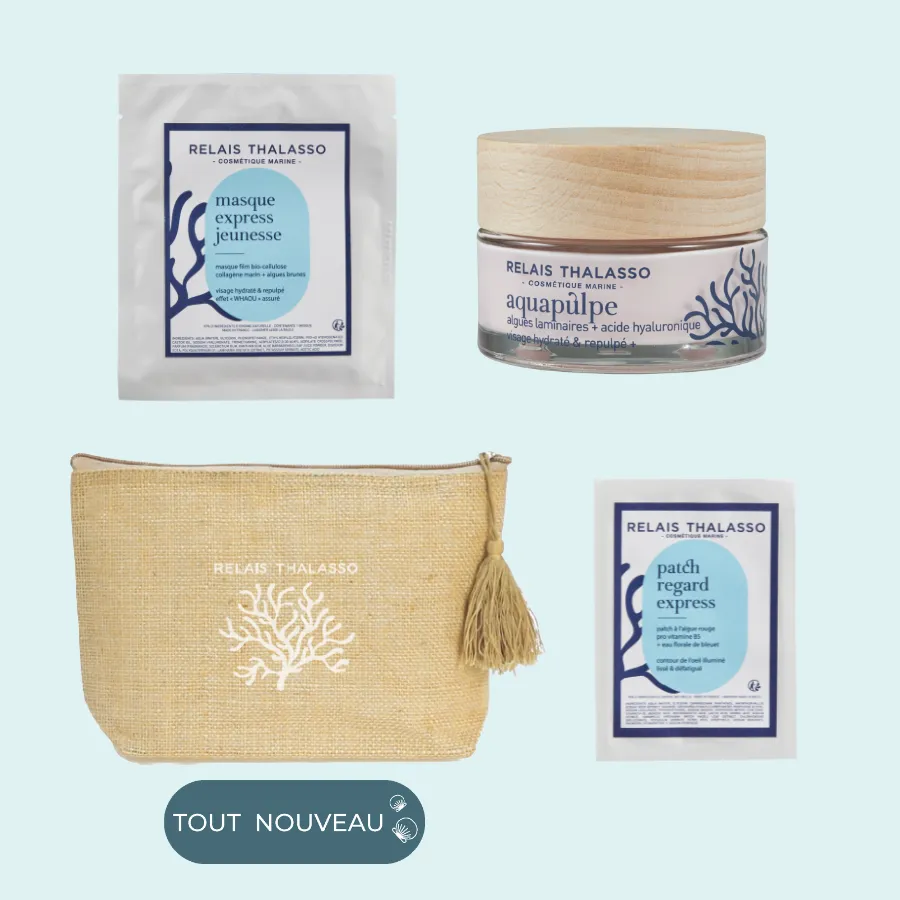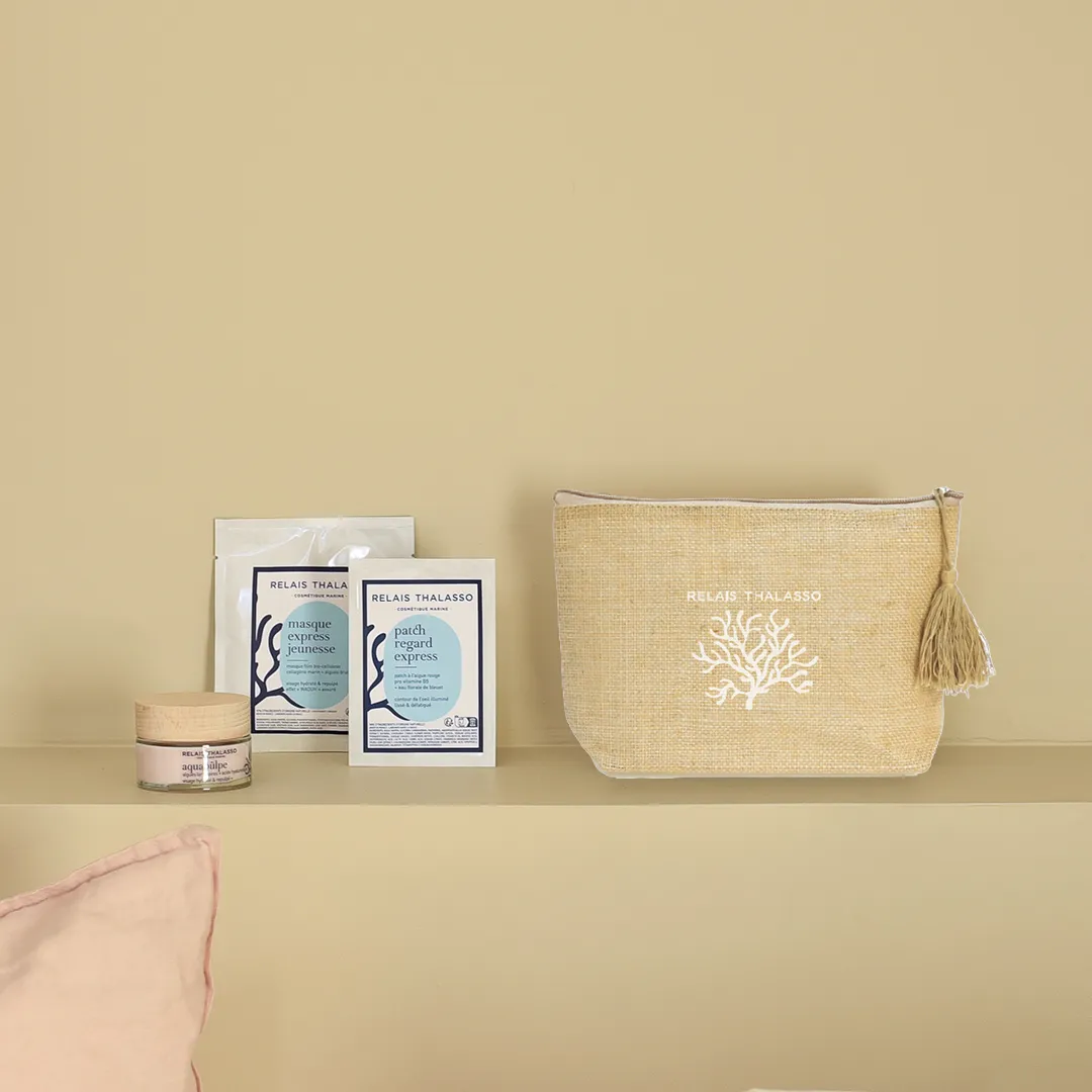 Je suis la Trousse Visage, votre compagne de voyage pour emporter partout les secrets de la thalassothérapie et prolonger votre routine bien-être, où que vous soyez. Élégante, pratique et fabriquée avec soin en Bretagne, j’accueille parfaitement vos soins marins favoris.